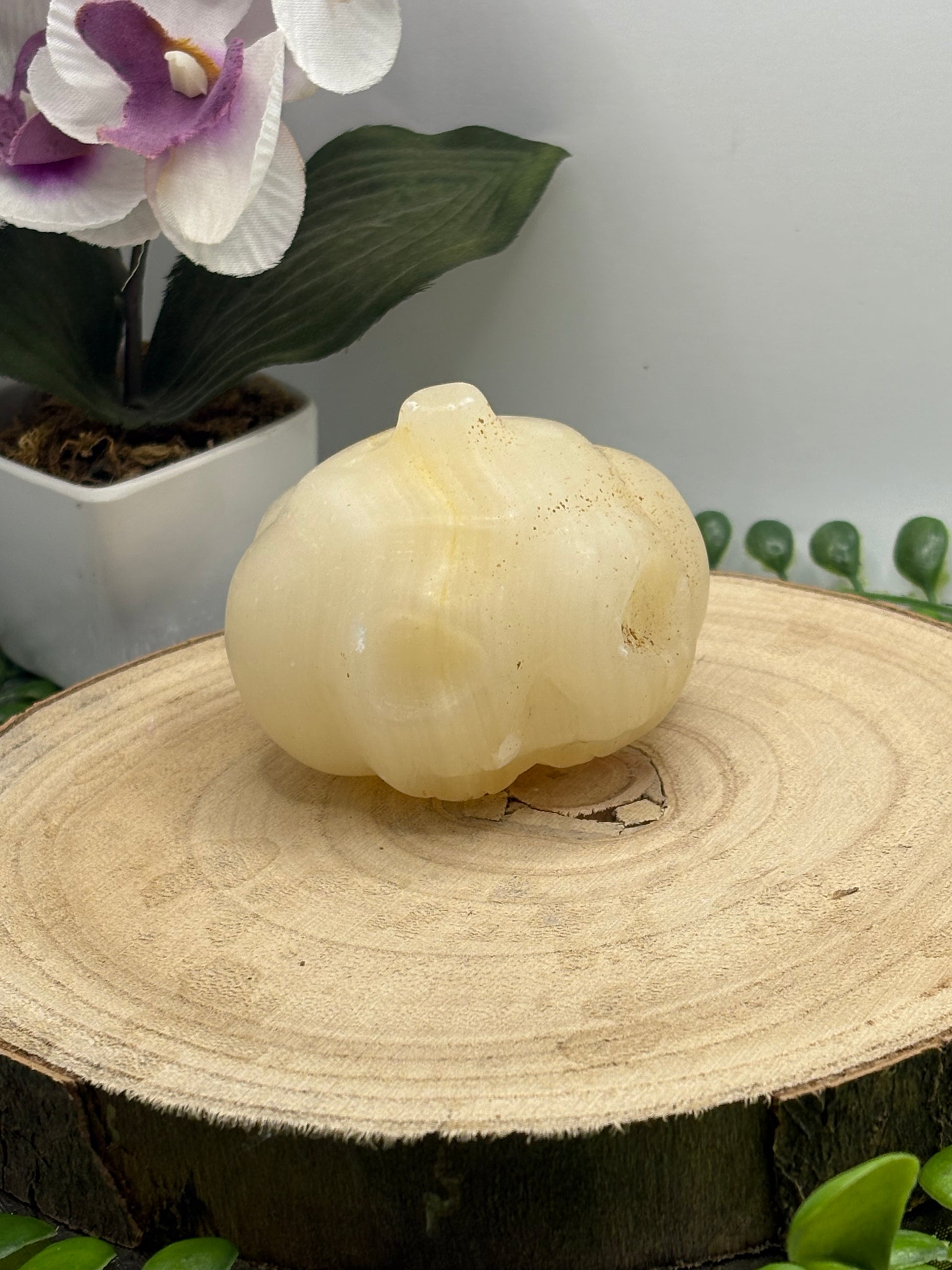 Diese außergewöhnlichen Kürbisse aus Orangencalcit vereinen kunstvolle Handarbeit mit der warmen Energie des Minerals. Jeder Kürbis wurde detailreich geschnitzt und ist ein echtes Unikat – ein Highlight für die Herbst- und Halloweenzeit.