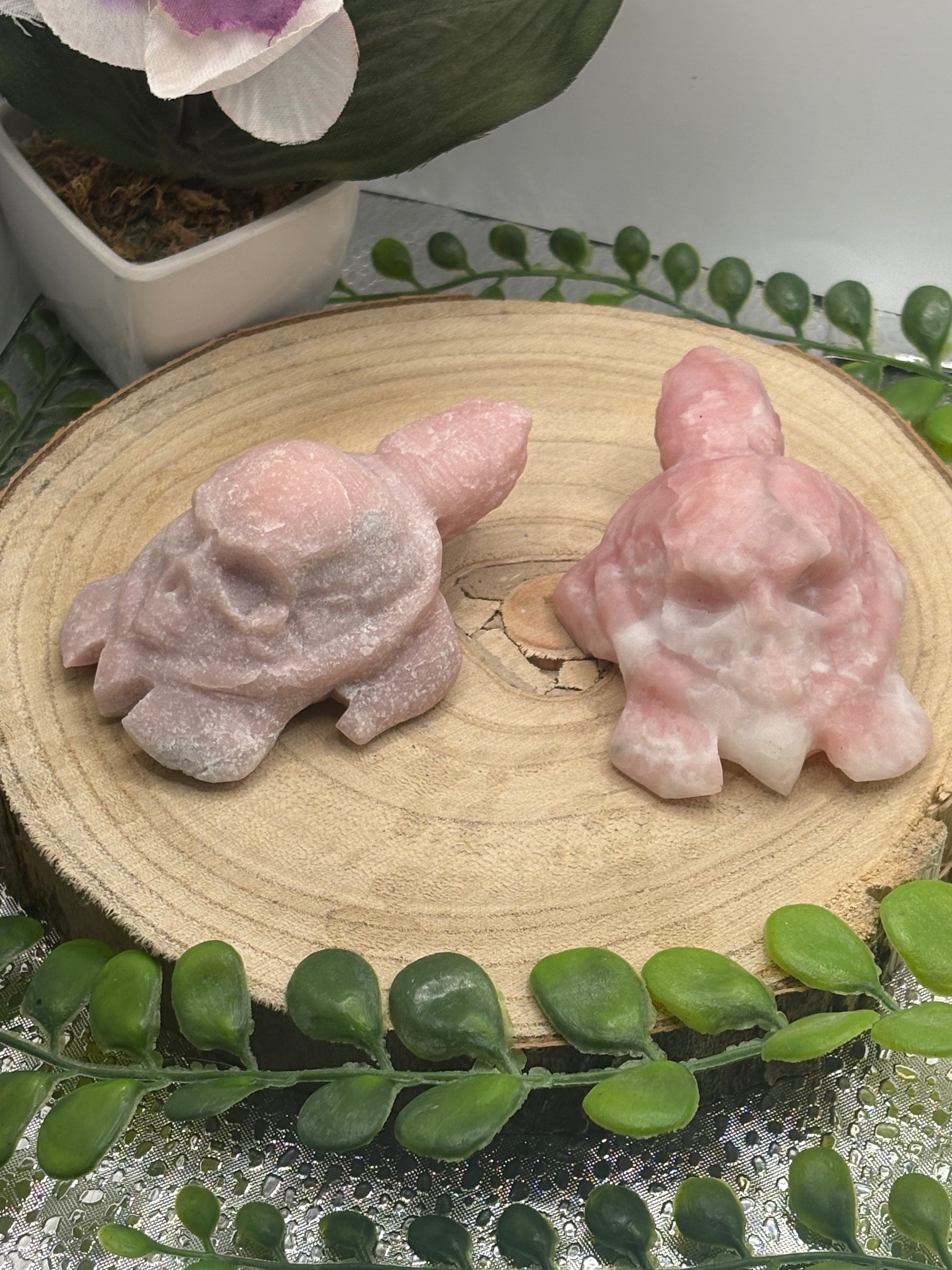 Diese außergewöhnliche Figur vereint zwei kraftvolle Symbole in einem kunstvollen Werk: Eine Schildkröte aus Pink Opal, deren Rücken als Panzer die Form eines Totenkopfes trägt. Ein seltenes und einzigartiges Stück, das Stärke, Transformation und Schutz in sich vereint.
