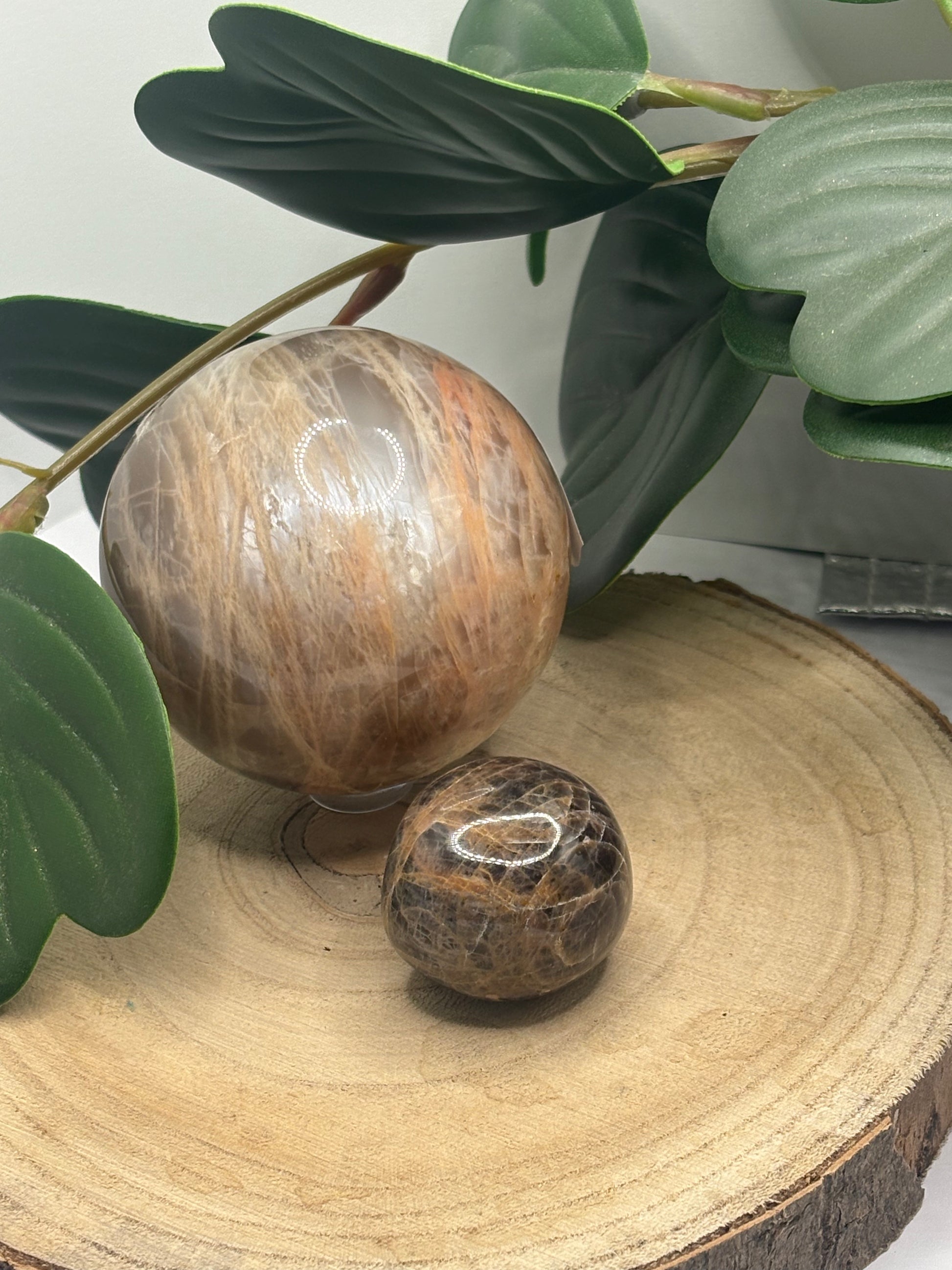 Mondstein-Kugel + Mondstein-Trommelstein als Geschenk.