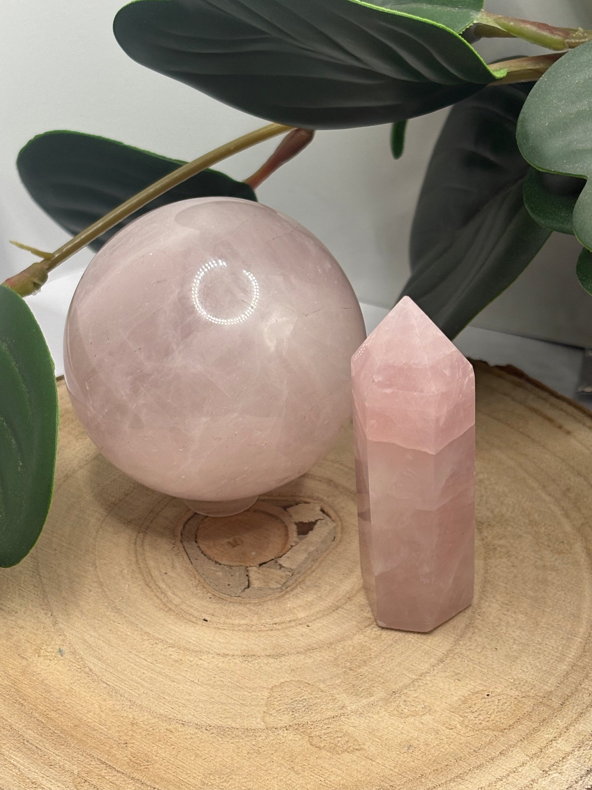 Rosenquarz-Kugel + kleiner Rosenquarz-Turm gratis dazu.